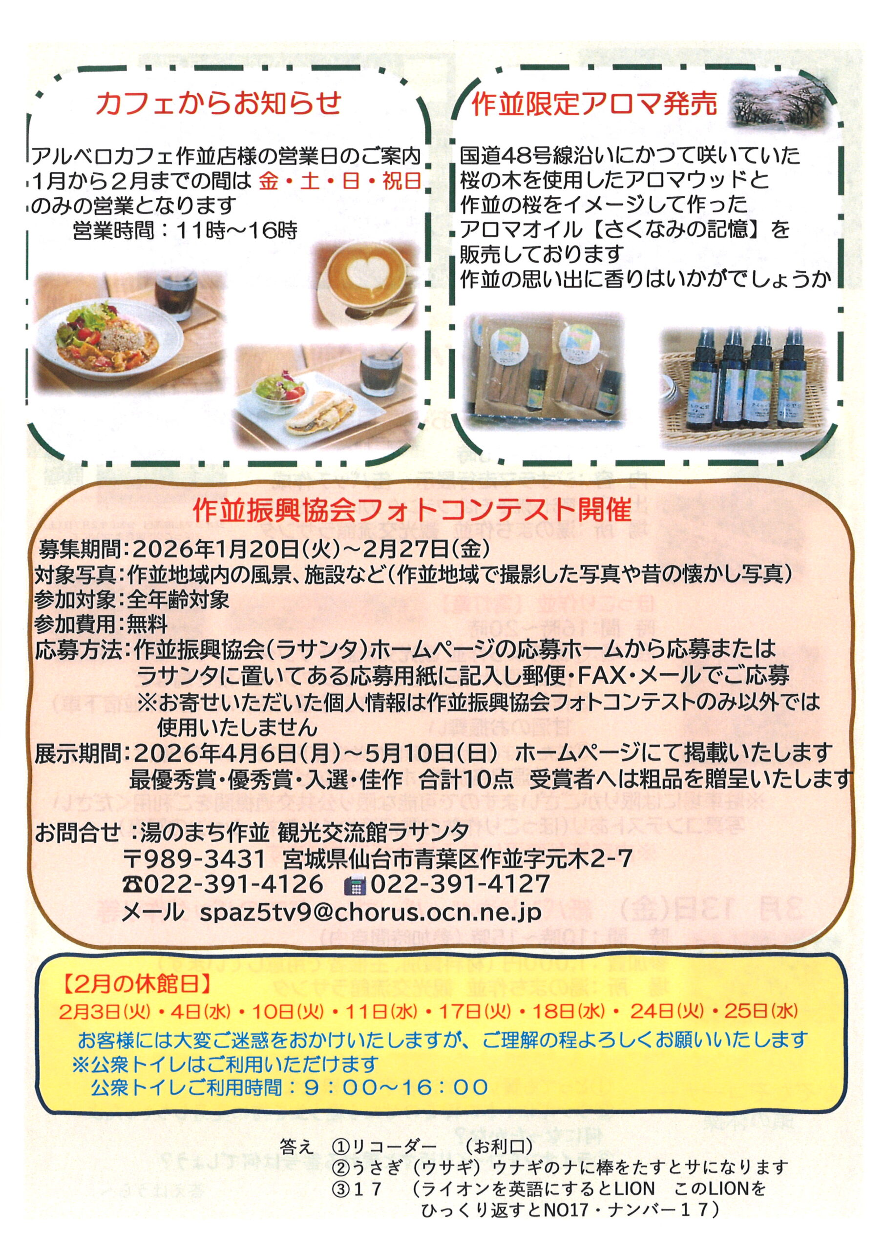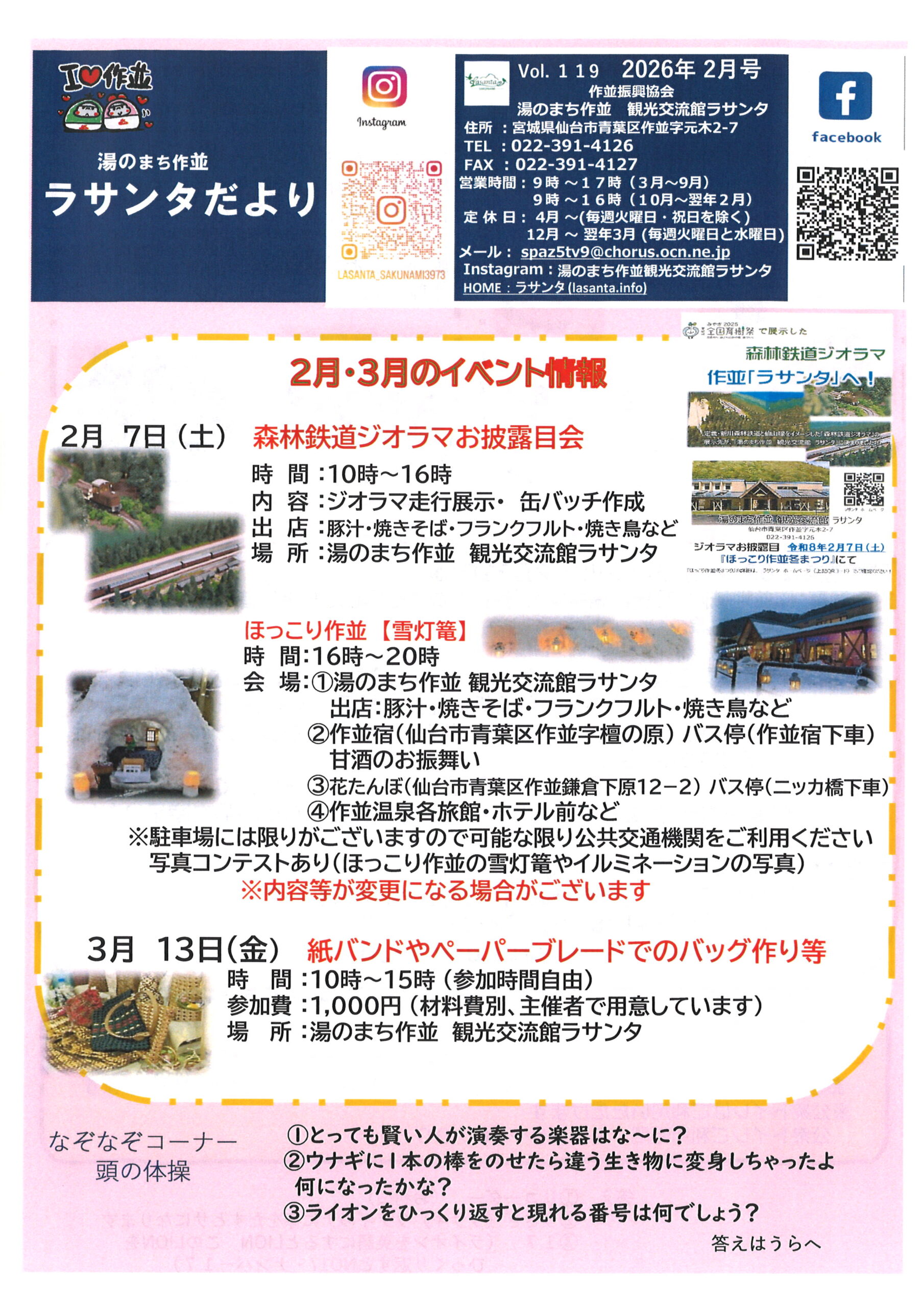 ラサンタだより2月号をお届け 投稿公開日:2026年1月31日 毎月発行しているラサンタだよりをお届けいたします おすすめ 仙山交流市 11/26(日)10:00- 2023年10月15日 9月の休館日のお知らせ 2025年8月31日 1月11日(日)ワークショップ開催 2025年12月25日