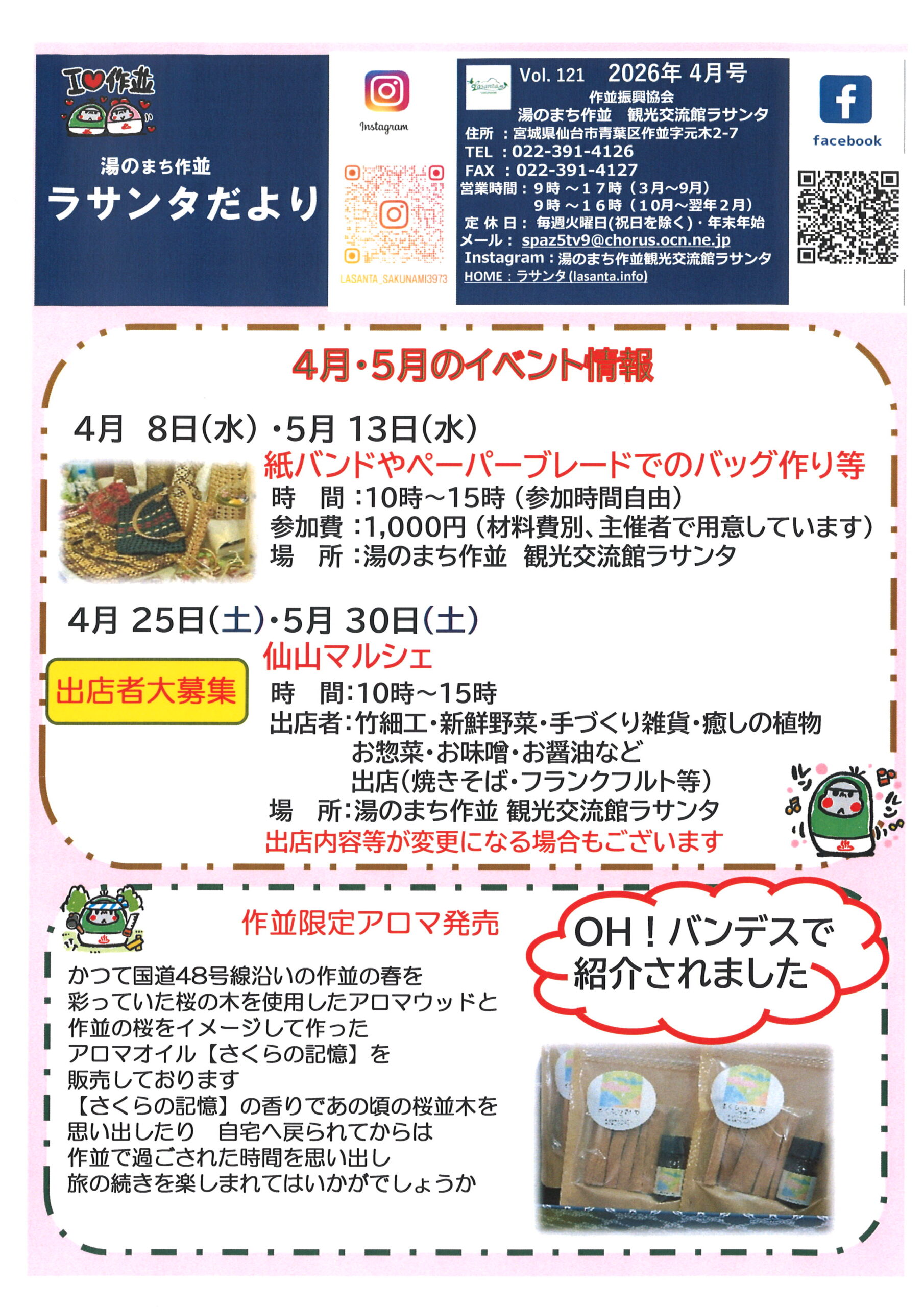 ラサンタだより4月号のお届け 投稿公開日:2026年3月28日 毎月発行しているラサンタだよりをお届けいたします おすすめ 足湯オープンいたします 2026年2月28日 9月21日(日)ワークショップ開催のお知らせ 2025年8月31日 しめ縄作り体験 12月15日(日)・21日(土) 2024年11月18日